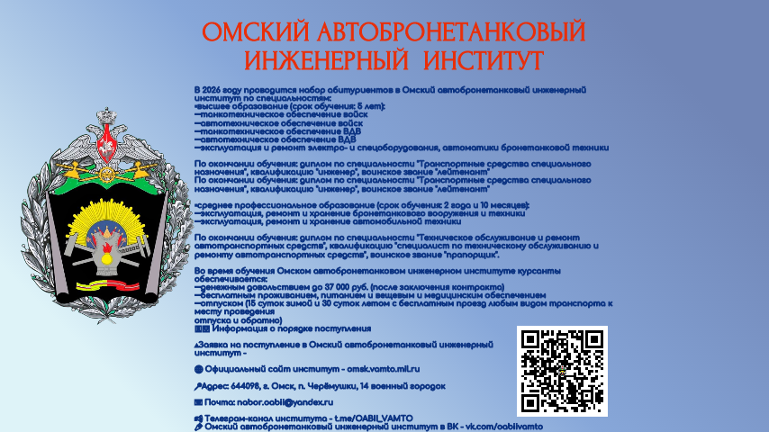 В 2026 году проводится набор абитуриентов в Омский автобронетанковый инженерный институт по специальностям: